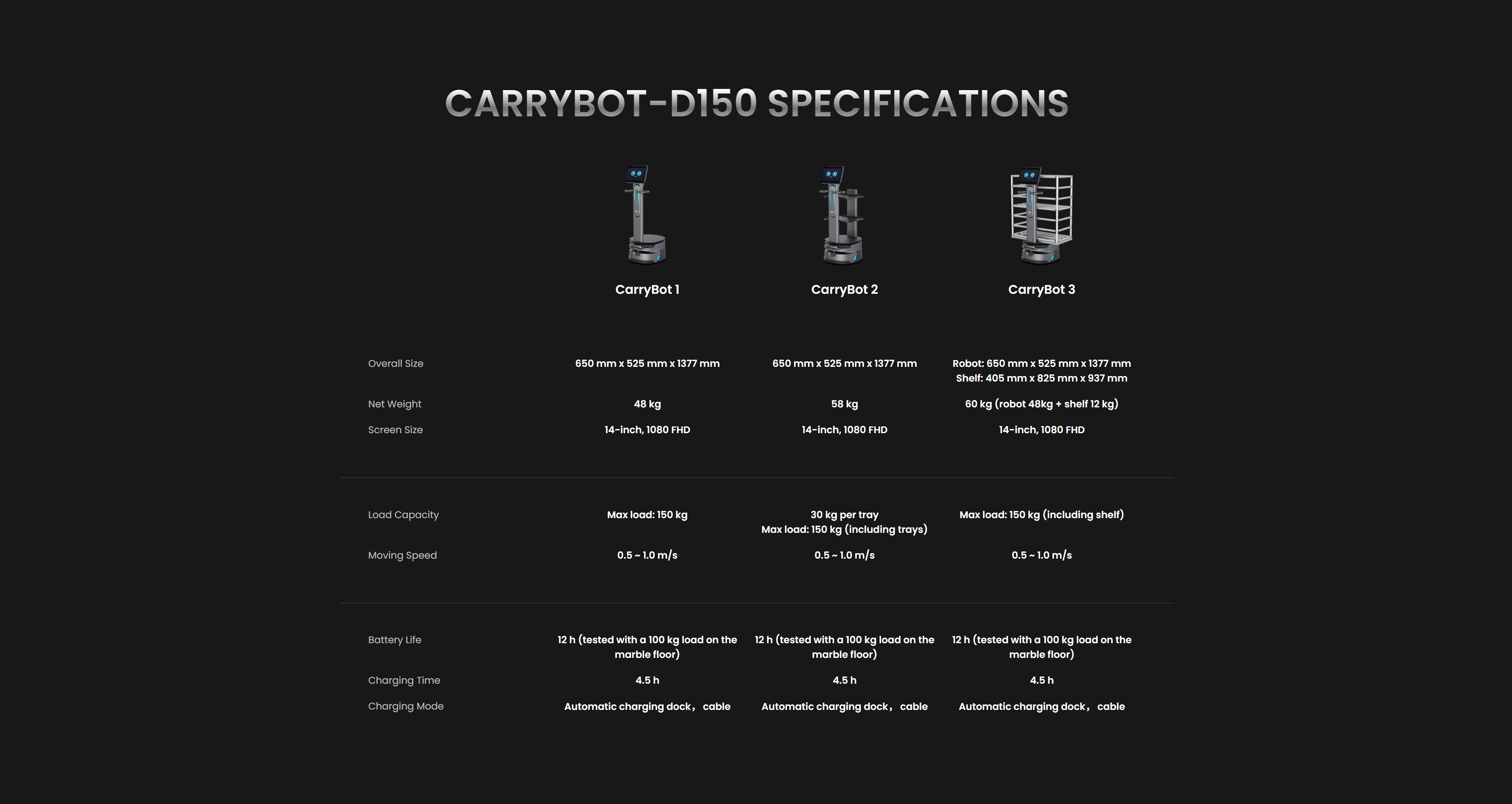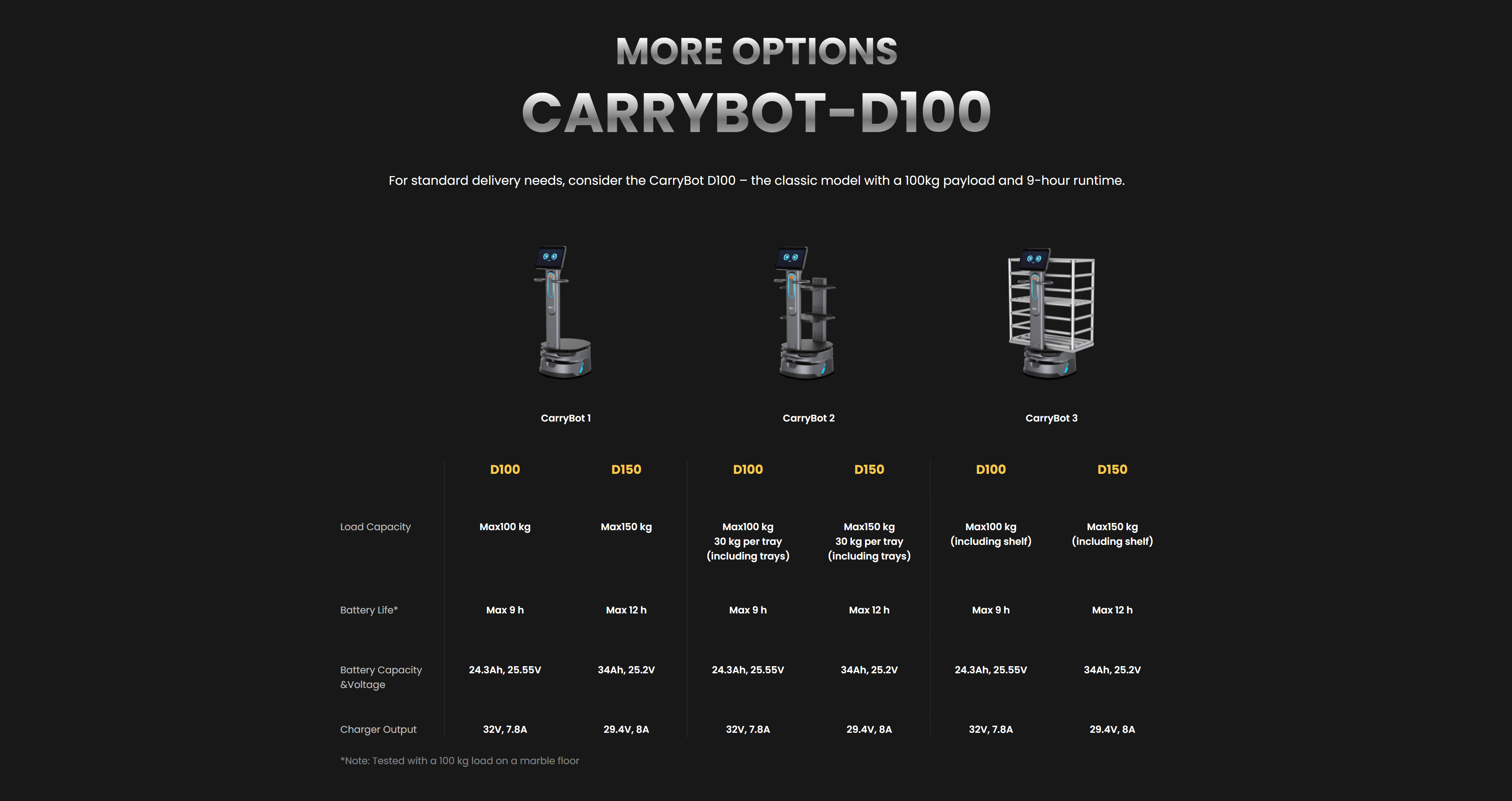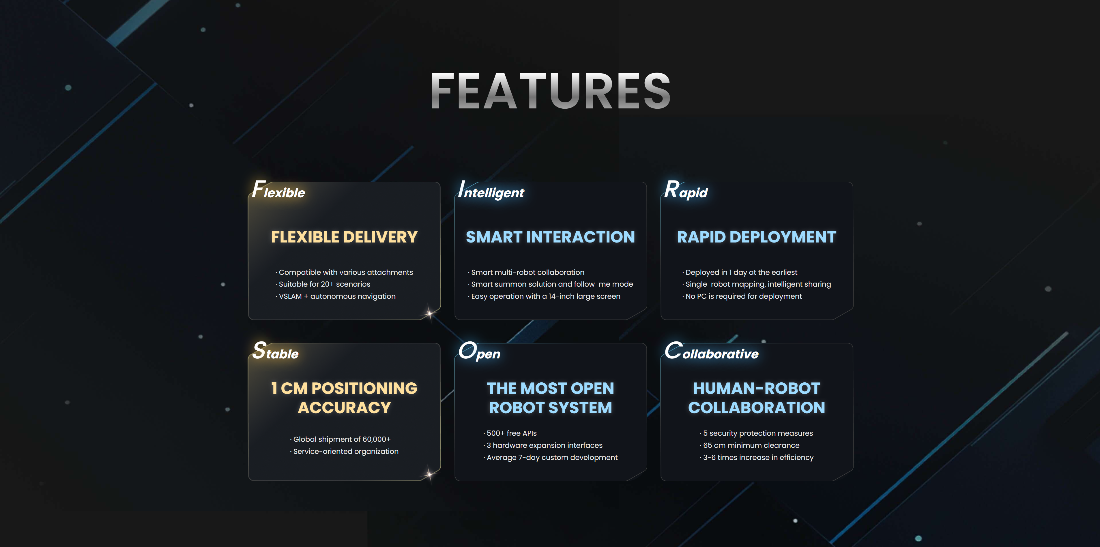 Features: 100-150kg payload, Qualcomm 845 chip, 240-degree 3D obstacle avoidance