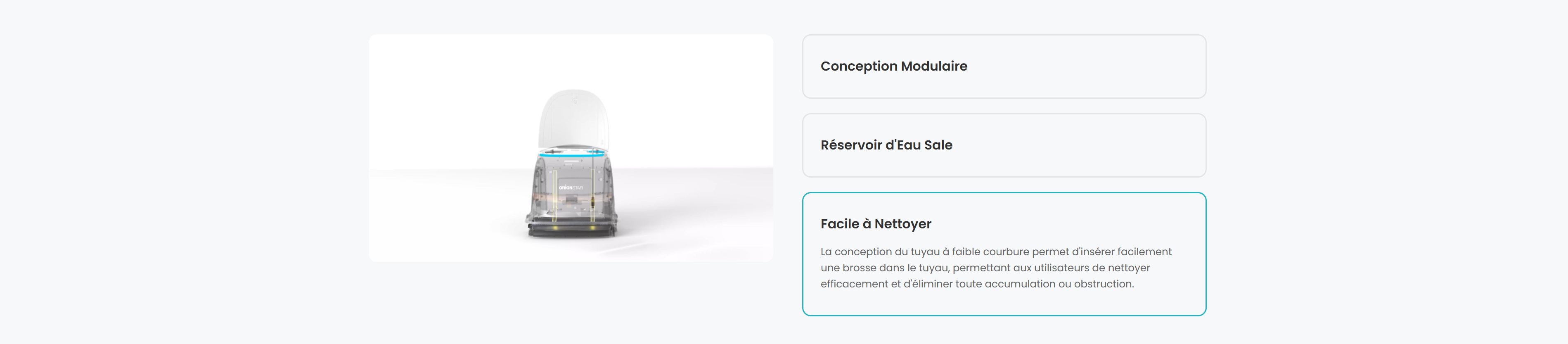 Sa conception modulaire et hygiénique facilite l'accès, le nettoyage et le remplacement des pièces : n'importe quel membre du personnel peut l'entretenir en quelques minutes.