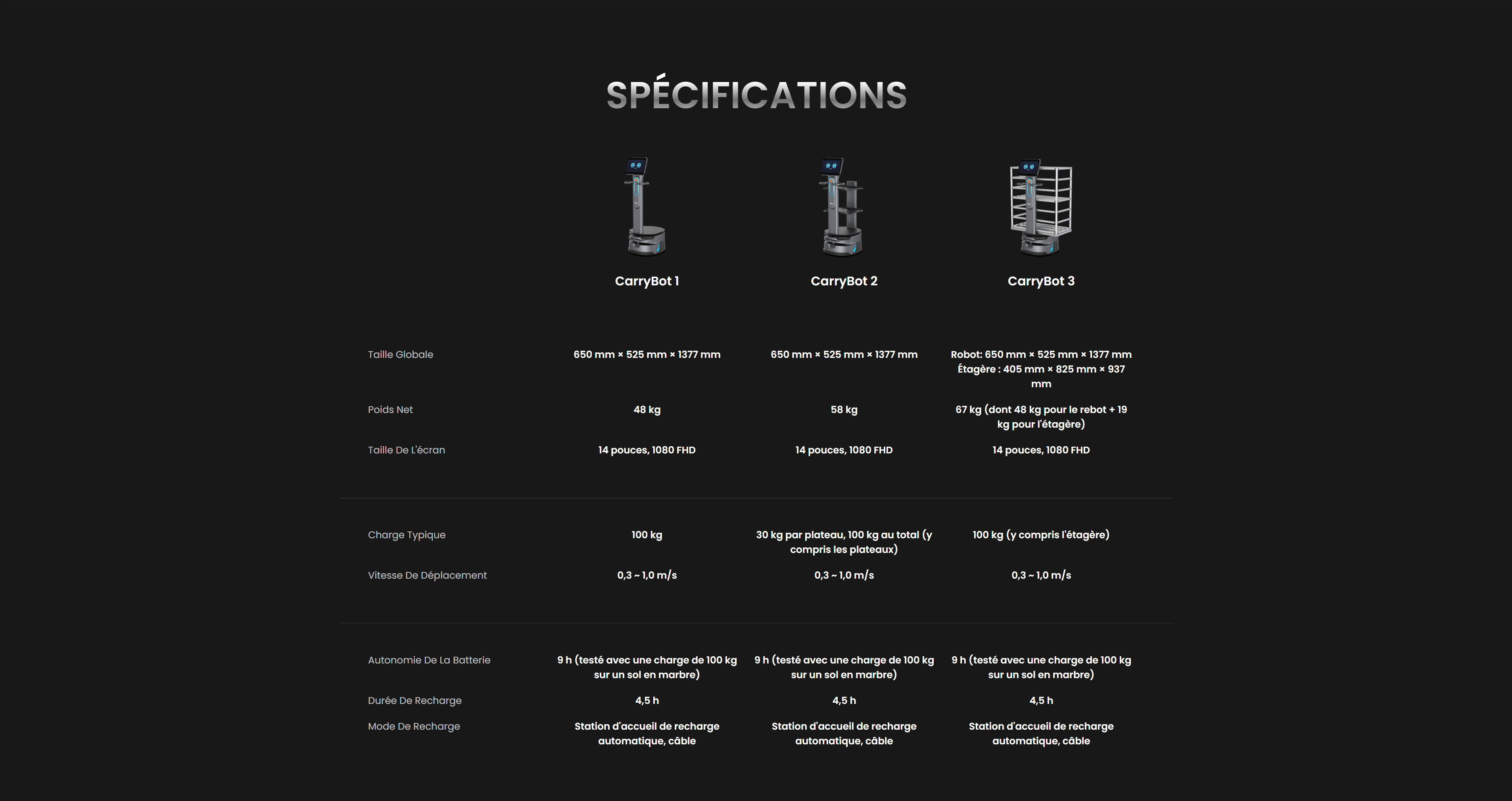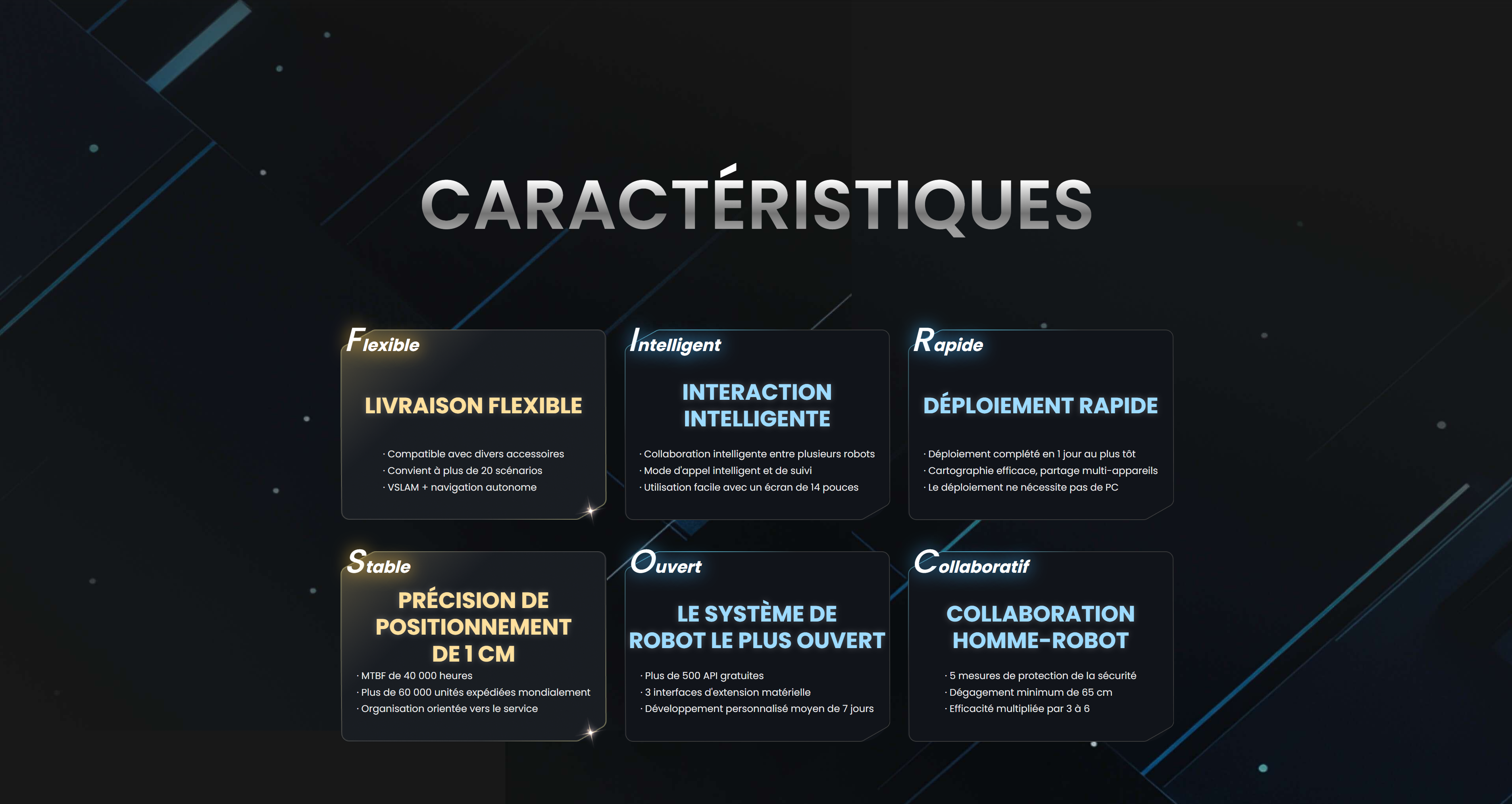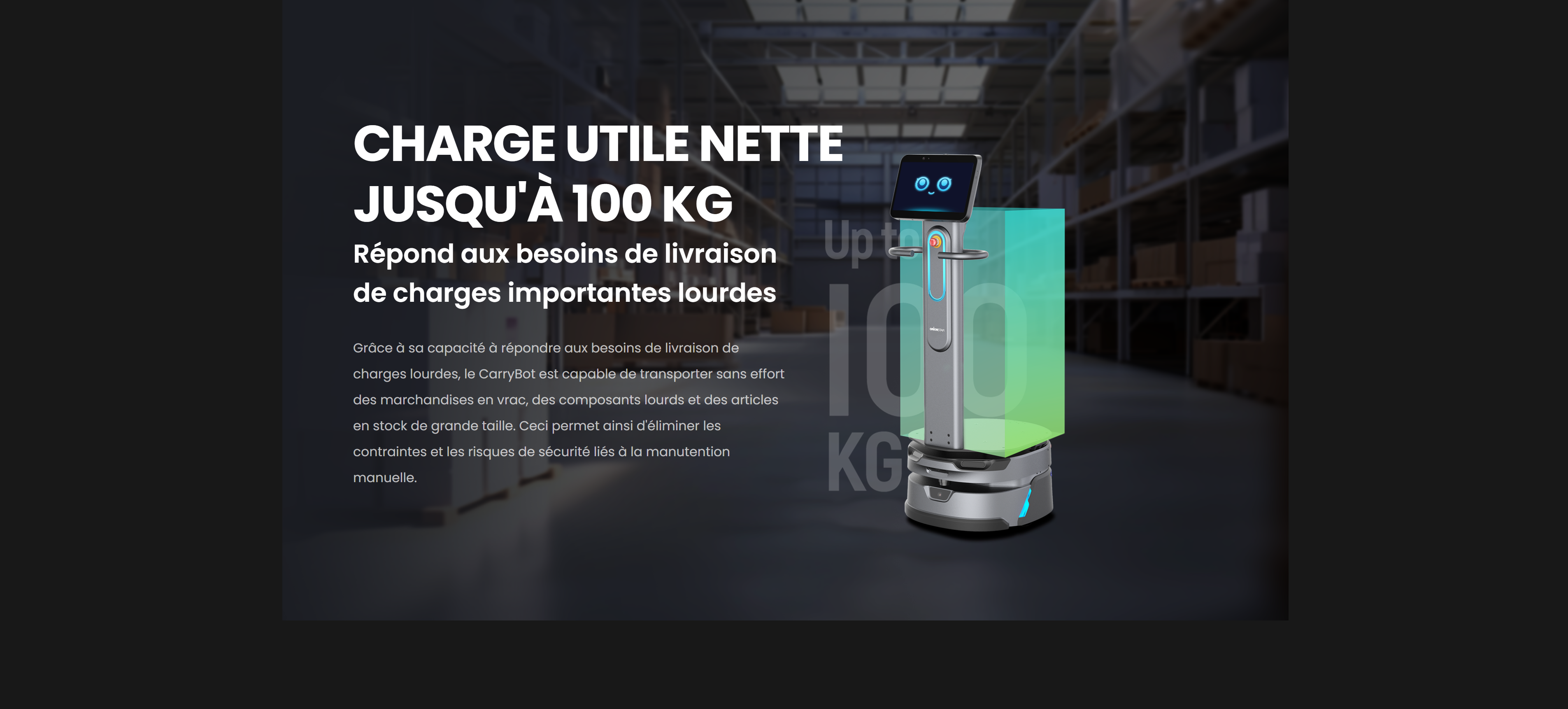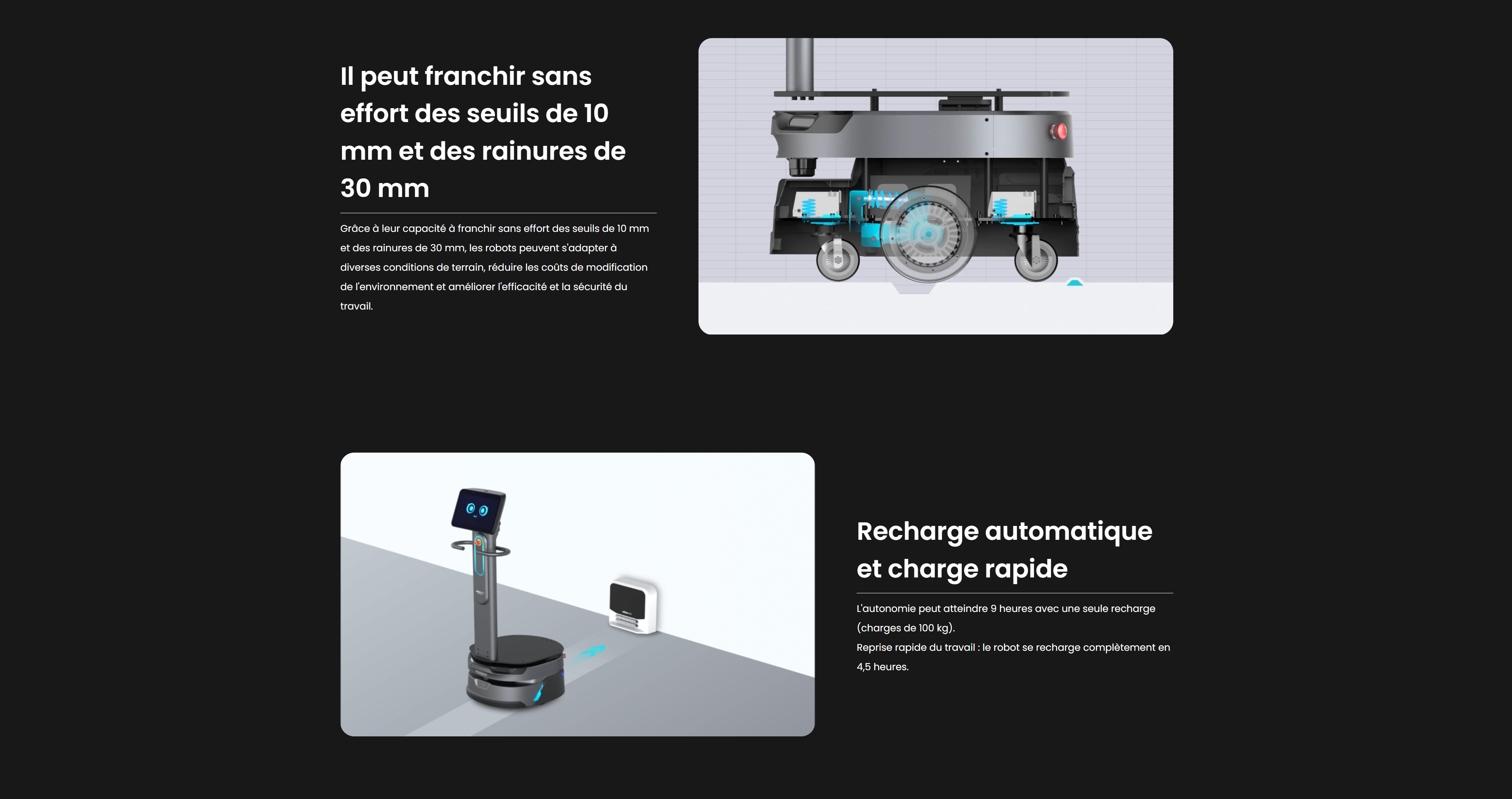 Caractéristiques : Charge utile de 100 à 150 kg, puce Qualcomm 845, évitement d’obstacles 3D à 240 degrés