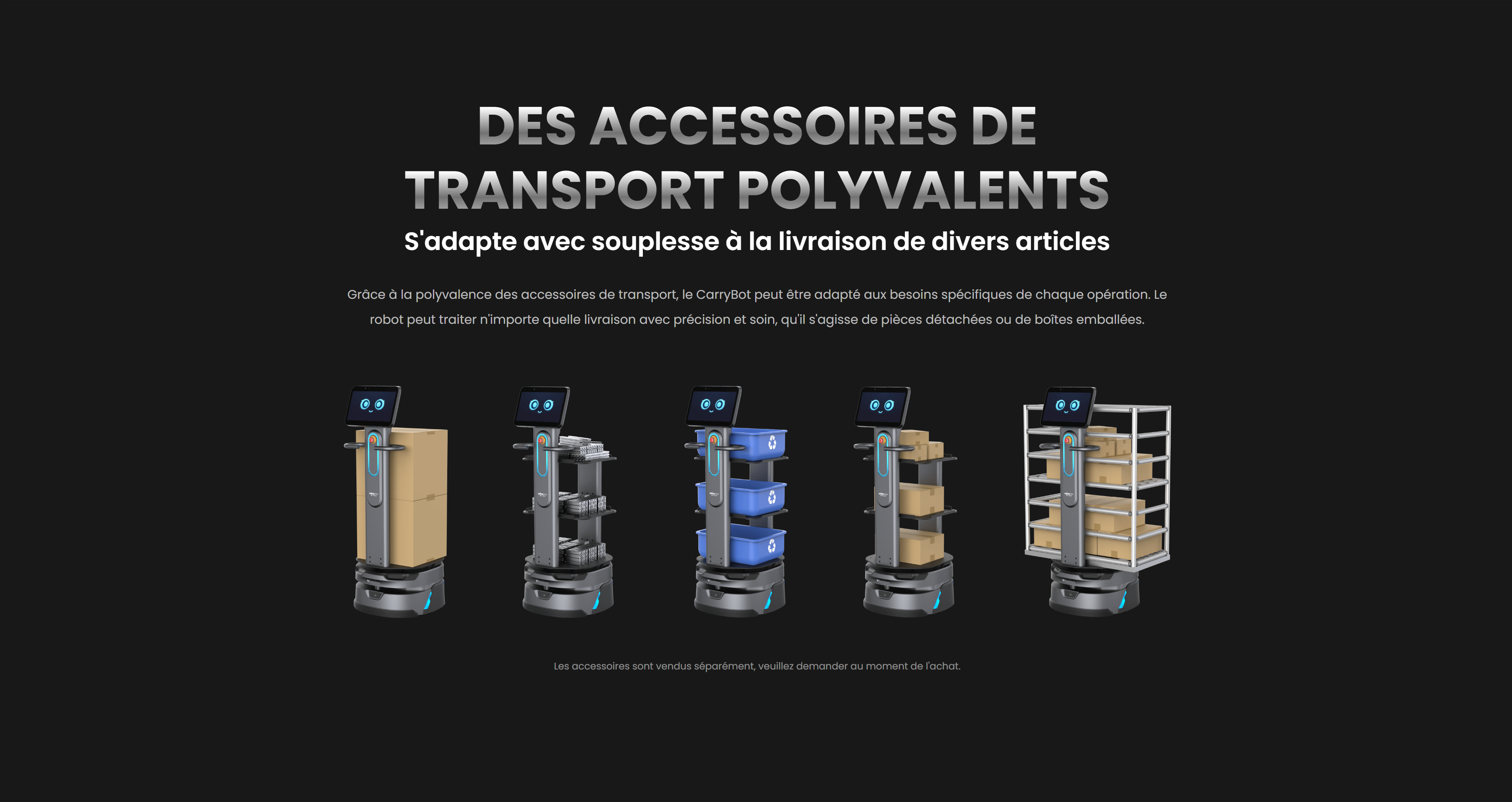 Fonctions : Transport de charges lourdes, accessoires flexibles, positionnement précis